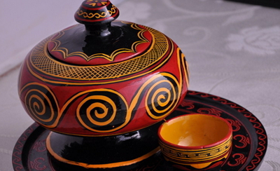 传统的漆器餐具,即漆涂在各类用于摄取或分发食物的用具和器皿的表面,所制成的日常器物,比如碗、筷、勺、盘、碟、壶、杯子、酒器、盛器等。通常以木、竹、钙塑等原料制成,具有易洗、不易破碎和良好隔热效果。