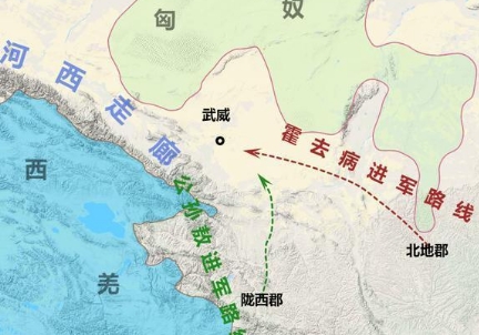 紧接着汉军像闪电般的一路狂奔,由西北方向转向西南,经过小月氏(今甘肃酒泉一带),沿祁连山向东迂回,深入匈奴境内两千多里路,绕到浑邪王、休屠王的后方。