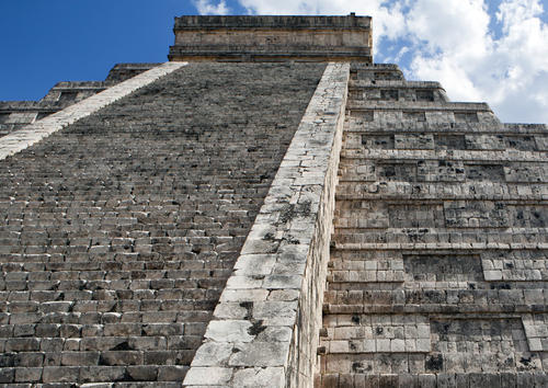 以库库尔坎金宇塔为例:塔基呈四方形,共分九层,由下而上层层堆叠而又逐渐缩小,就像一个玲珑精致而又硕大无比的生日蛋糕。塔的四面共有91级台阶,直达塔顶。四面共364级,再加上塔顶平台,不多不少,365级,这正好是一年的天数。九层塔座的阶梯又分为18个部分,这又正好是玛雅历一年的月数。