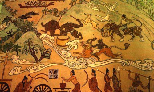 据说蚩尤族善于制作兵器,其铜制兵器精良坚利,且部众勇猛剽悍,生性善战,擅长角牴,进入华北地区后,首先与炎帝部族发生了正面冲突。蚩尤族联合巨人夸父部族和三苗一部,用武力击败了炎帝族,并进而占据了炎帝族居住的“九隅”,即“九州”。炎帝族为了维持生存,遂向同集团的黄帝族求援。