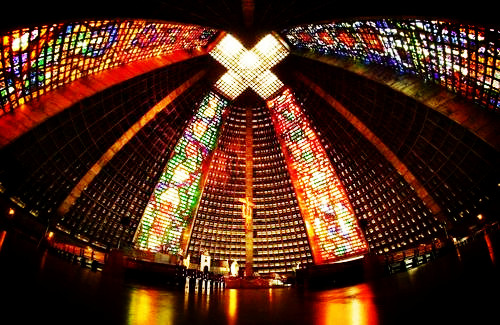 里约大教堂又被称天梯教堂,历经12年时间,终于在1976年落成投入使用。她的风格迥异于同时期欧洲古老典雅教堂。里约大教堂的主体建筑是一座顶端呈圆锥形,造型时尚,给人金字塔般印象的钢筋水泥为主要建筑原料的现代建筑。教堂全身高80米,底座直径106米,可容纳2万人。