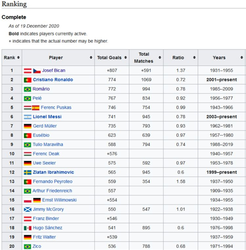 维基的排名,排名更新于C罗与梅西本周的进球后,这一家排名比较全,以下是排名: