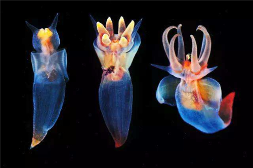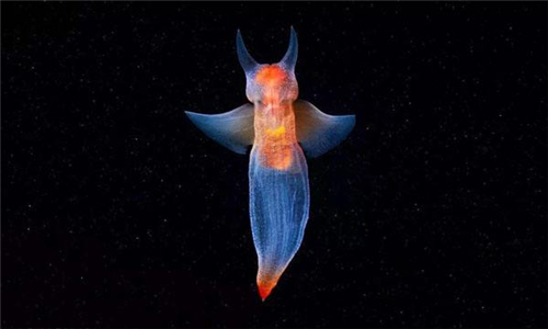 这只看起来像幽灵一样的冰海天使,其学名为“platybrachium antarcticum”。它正在环南极海域的深水中捕食。冰海天使上半身橙色的部分是它的消化和生殖器官,它身上类似翅膀的附着物是由脚进化而成,让它能在海洋环境中畅游,这些“翅膀”大约每秒拍动两次。