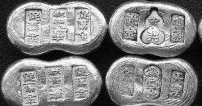 常见的是50两一锭的船形元宝,下面还有各种大小的小元宝。银锭上一般有文字,记有铸造地名、重量和,银匠的姓名,还有年号;但是小锭上有时不铸文字。