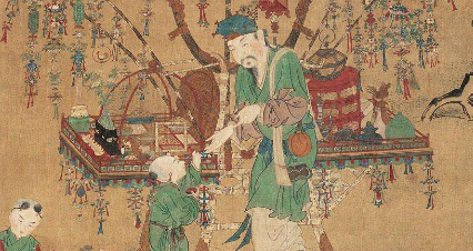在商品流通日益广泛的宋代,乡村货郎是极受孩子们喜爱的流动小贩。他们能说会道、走街串巷,用那些针头线脑、花纸糖人点缀着人们的日常生活。他们穿戴奇特、货物杂多,所到之处准能给孩子们带来欢乐。画家正是抓住了这一富有情趣的生活瞬间,反映了生活的丰富多彩。