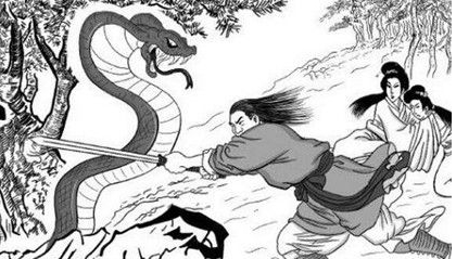 有人说前面有一条好大的白蛇挡住了去路。只见他大喝一声,提着三尺剑就那么轻飘飘地一挥,那蛇便一动也不动了。众人再一看,那条大蛇早已被斩断成两段了。