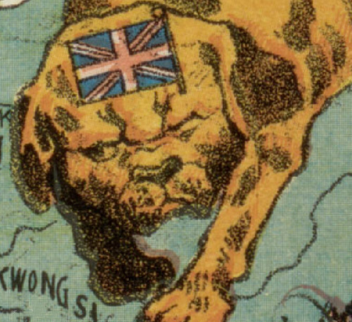 再者,在广东的下方,香港的左面画了一只虾,很可能是暗指葡萄牙(侵占澳门)。但由于太小,一直以来都被忽视了。