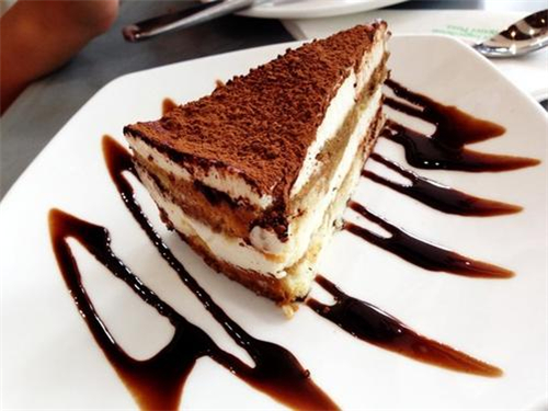 提拉米苏(Tiramisu)吃到嘴里香、滑、甜、腻、柔和中带有质感的变化,味道并不是一味的甜,因为有了可可粉,所以略微有一点苦涩,这正好与卡布奇诺相配。