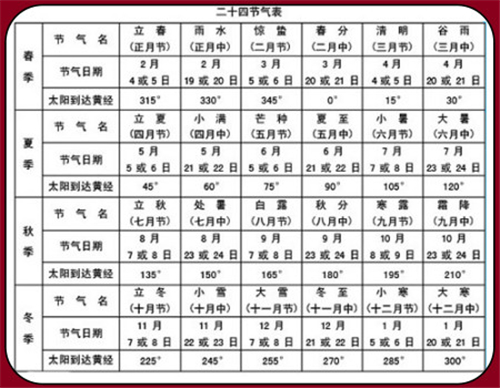 24个节气分别为:春季的立春、雨水、惊蛰、春分、清明、谷雨;夏季的立夏、小满、芒种、夏至、小暑、大暑;秋季的立秋、处暑、露水、秋分、寒露、霜降;冬季的立冬、小雪、大雪、冬至、小寒、大寒。