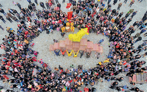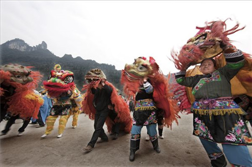 有的苗家板眼更足;堂屋前的三扇门同时敞开,堂屋正画一只大乌龟,家先牌位下的八仙桌上,喝下中间的一碗酒,剩下的两碗,一碗敬天,一碗奠地。一口气利索的做完这些套路,狮子方可倚桌而立,纵身跃起咬下悬在天花板的“红封儿”,摇头摆尾给主人家作揖拜年。然后退出大门,另觅别家。这种特殊的待客方式,使得那位“渔人”不得不在桃花源里“居数日”而后才“辞去”。