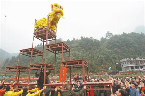“雄狮”抖擞精神踩小方桌倒立的四脚,悬空转圈表演惊险的绝技,先是狮子头舞东西南北四方,拜天拜地。接着,跃上立起的木杠巅“雄鹰展翅”;或舞狮人用头顶住钢刃口倒立“熬鱼撑天”。最精彩的一招叫“鲤鱼标滩”。狮子大吼数声,从“桌塔尖”腾跃而下,稳稳落在土坪上,不是武功精湛的舞狮者是不敢轻易尝试这一招的。