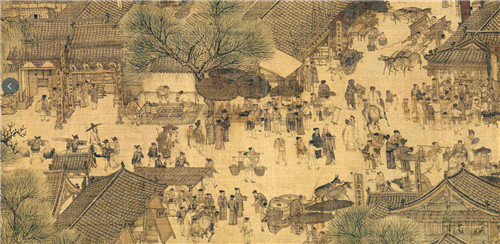 大到广阔的原野、浩瀚的河流、高耸的城郭,细到舟车上的钉铆、摊贩上的小商品、市招上的文字,和谐的组织成统一整体,在画中有仕、农、商、医、卜、僧、道、胥吏、妇女、儿童、篙师、缆夫等人物及驴、牛、骆驼等牲畜。
