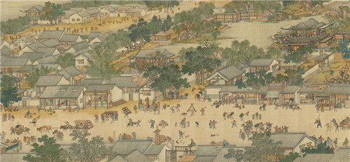 有赶集、买卖、闲逛、饮酒、聚谈、推舟、拉车、乘轿、骑马等情节。画中大街小巷,店铺林立,酒店、茶馆、点心铺等百肆杂陈,还有城楼、河港、桥梁、货船,官府宅第和茅棚村舍密集。
