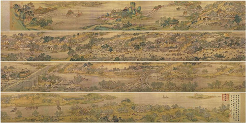 画中所摄取的景物,大至寂静的原野,浩瀚的河流,高耸的城郭;小到舟车里的人物,摊贩上的陈设货物,市招上的文字,丝毫不失。画面中,穿插着各种情节,组织得有错落有致,同时又具有情趣。