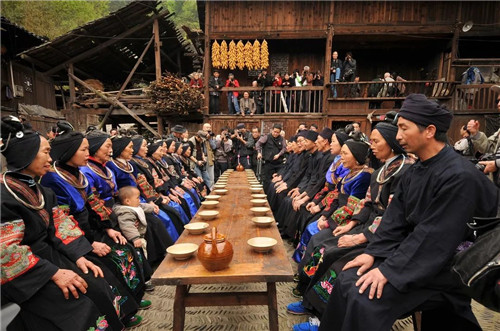 一个宗族就是一个大鼓社,称“黑社”,又有许多分社,苗族称为兄弟鼓社,又称“白社”。“黑社”一般有果略(即鼓头)、果叙(即歌头)、果当(桌头)、果熙(礼头)、果扎(武头)、果养(活路头)、顶王(护头)、顶榜(护尉)、珈也扬(粮头)等头领,共称为“鼓社九鼓头”,由他们共同领导全社事务。