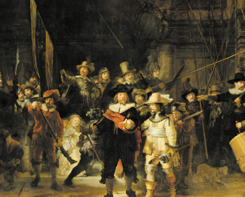 《夜巡》无疑是伦勃朗最负盛名的杰作,它与达·芬奇的《蒙娜丽莎》、委拉斯凯兹的《宫娥》并称为“世界三大名画”。这幅画创作于1642年,是阿姆斯特丹射击手公会委托伦勃朗绘制的一幅集体肖像画。当时,团体肖像画通常遵循传统模式,人物整齐排列,姿态僵硬,缺乏生动性。然而,伦勃朗却大胆突破常规,以一种戏剧性的舞台效果来呈现画面。