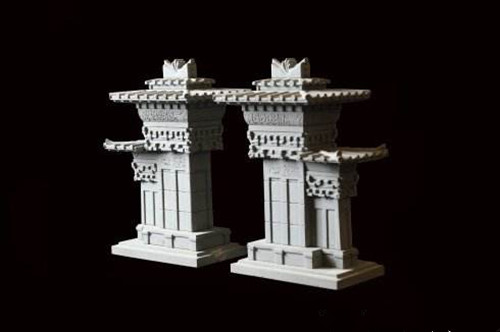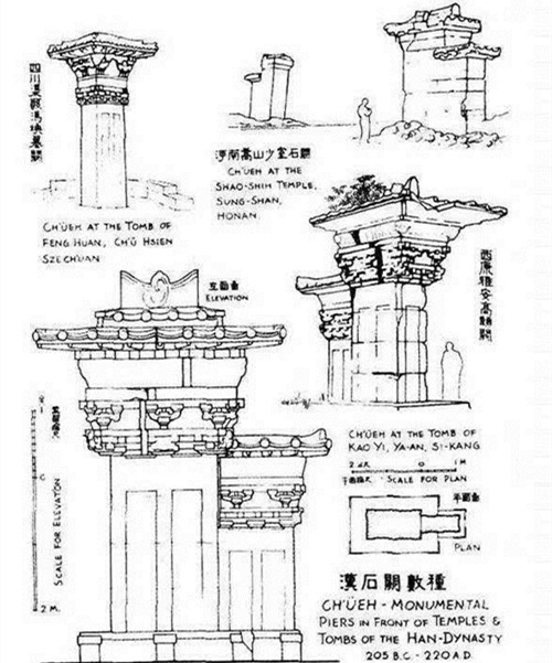 在中国古代建筑中,门之设立,最早始源于一种防卫上的需要,而阙则属于“宫门”的形制,即建在宫门或陵墓等建筑群前的左右对称的建筑物,两阙间空缺的地段为通向阙后建筑物的道路。其构造是中央无门扇,“阙”与“缺”相通,两阙之间为一通道,“阙然为道”,这也是其名称的由来,在中国已有两千多年的历史。汉代的地面建筑,留存至今较为完整的只有阙。