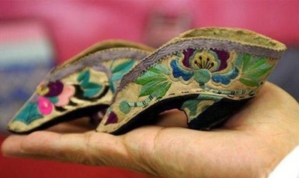 在古代,女子以小脚为美,“三寸金莲”就是用来形容女子小脚的,“三寸金莲”也叫缠足,古代女子用布将双脚紧紧缠裹,使其脚畸形变小,以为美观。一般女子从四、五岁起便开始缠足,直到成年骨骼定型后方将布带解开,也有终身缠裹者。