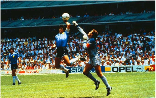 1986年6月22日,在墨西哥城阿兹台克体育场进行的1986年墨西哥世界杯足球赛1/4决赛中,时任阿根廷国家队队长的迭戈·马拉多纳用手把球攻入了英格兰队的球门,这就是著名的“上帝之手”(Hand of God)事件。