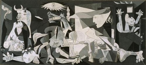 《格尔尼卡》是西班牙立体主义画家帕勃洛·鲁伊斯·毕加索于20世纪30年创作的一幅巨型油画,长7.76米,高3.49米,现收藏于马德里国家索菲亚王妃美术馆。该画是以法西斯纳粹轰炸西班牙北部巴斯克的重镇格尔尼卡、杀害无辜的事件创作的一幅画,采用了写实的象征性手法和单纯的黑、白、灰三色营造出低沉悲凉的氛围,渲染了悲剧性色彩,表现了法西斯战争给人类的灾难。