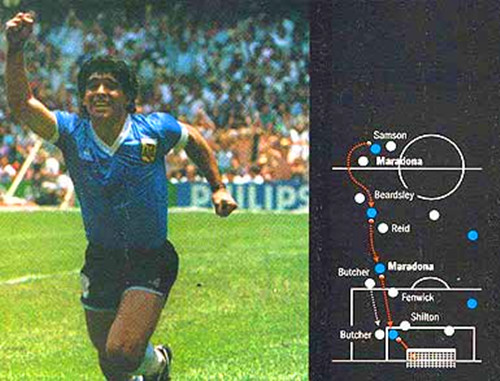如果说这个球的争议很大,那么五分钟后发生的一切足以令整个世界为之震惊,马拉多纳在中场开始盘带,连过4名英格兰队的防守队员直插禁区,最后晃过出击的门将希尔顿将球打入。这一匪夷所思的进球直到今天还被人们时常提起,这粒精彩的进球也被评为世界杯历史上的最佳进球。在马拉多纳如此不可思议的表现下,英格兰队尽管由莱因克尔追回一球,但是已经无济于事,阿根廷队以2-1的比分淘汰对手,晋级四强。