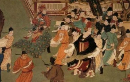 由绯色罗袍裙、衬以白花罗中单,束以大带,再以革带系绯罗蔽膝,方心曲领,白綾袜黑皮履。六品以上官员挂玉剑、玉佩。