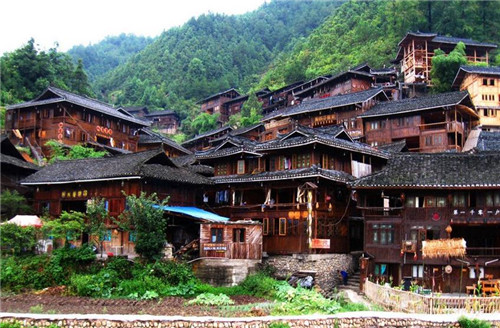 苗寨的主体部分仍是黑瓦房,吊脚落。黑瓦房通常分五柱四挂、或四柱三挂。木制结构,两侧用竹子编封外糊泥墙。木板房上盖小青瓦,梁柱板壁全用桐油反复涂抹,风吹日晒,乌黑发亮。屋前砌有青石板小坪,搁有农具,风车等,屋前后栽有凤尾竹,枫香树或芭蕉林。进门跨过“虎口”是堂屋。