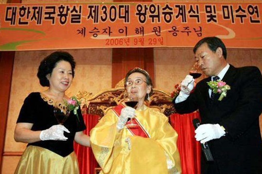 其实,韩国还就是一个非常重传统的国家,所以在这个背景下,2005年李朝王族后裔李海瑗自称“大韩帝国女皇”并在首尔举行加冕仪式,宣布朝鲜王朝复辟。“登基典礼”时,有50多位李氏宗族成员参加,而且不知道从哪里借来了一套龙椅之类的道具,场面上还真是那么回事。