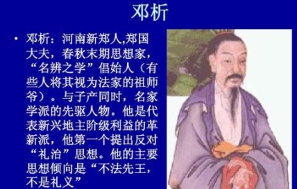 邓析(?~公元前501),春秋末年郑国思想家和革新家。子产执政时,任郑国大夫。从现有史料看,他是坚决反对;礼治”的先行者,;不法先王,不是礼义”。