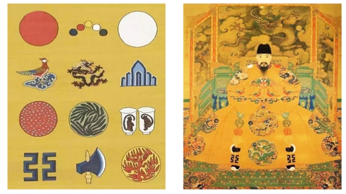 十二章纹作为中国古代黄袍的重要组成部分,十二章纹具有独特的文化意义和审美内涵。中国古代自“黄袍加身”以来,便把黄袍视为皇帝权威的载体。服饰图案通过使用太阳、月亮、花朵、鸟类和原始图腾等元素,反映了中华民族“天人合一”的文化观念和审美思想。
