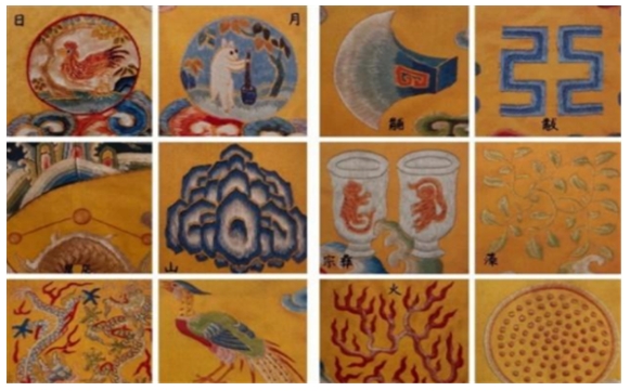 十二章纹,包括日、月、星辰、群山、龙、华虫、宗彝、藻、火、粉米、黼、黻。其涵盖了天文、地理、生物、神灵等万物规律,每章都有特殊的象征寓意。日、月、星辰,取其照临也;山,取其镇也;龙,取其变也;华虫,雉,取其文也;宗彝,虎蜼,取其孝也;藻,水草,取其洁也;火,取其明也;粉米,白米,取其养也;黼,斧形,取其断也;黻,为两己向背,取其辨也。