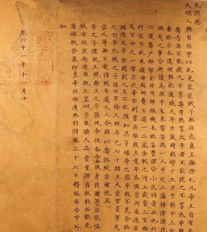 这个看似合理的改动,其实是站不住脚的,2013年一件物品的出现,将雍正“篡位”可能彻底击破,它就是“康熙遗诏”。这份收藏在辽宁省档案馆新馆的“康熙遗诏”,用满、汉、蒙三种文字书写了同样的内容。