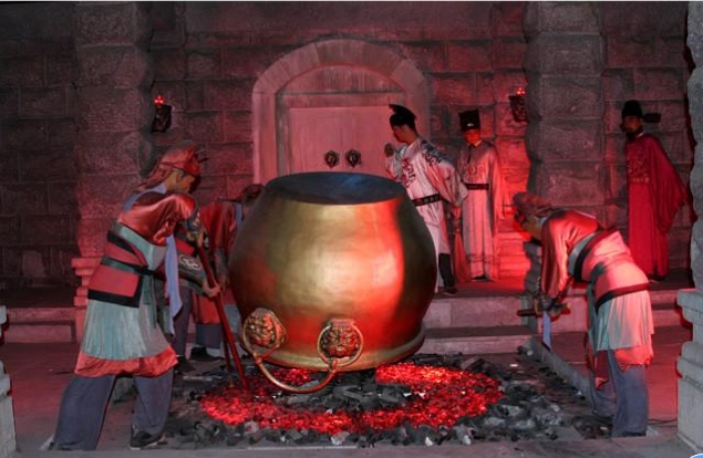 1426年(宣德元年)八月,朱高煦起兵造反,他在起兵前还企图勾结英国公张辅为内应,但被张辅告发。结果在宣宗御驾亲征之下,第二天就灰溜溜地出城投降,跪在地上磕头请命。按说谋反是杀全家的大罪,群臣也纷纷上表要砍了朱高煦,可宣宗皇帝和他爹一样心软,以汉王宗亲之故免其一死,杀其同党六百余人,流放戍边者两千多人,在西安门内盖了间宅子,把朱高煦父子软禁了起来。身为一个叛国的王爷,不砍头、不发配边疆、不进天牢,这也算是最好的结局了吧。然而作死不止的朱高煦依然是死性不改,后来,宣宗去探视朱高煦,却被朱高煦故意绊倒,皇帝很生气,后果很严重。宣宗大怒之下命人用三百斤重的铜缸将朱高煦扣住。但朱高煦勇武有力,竟将大缸顶起。宣宗又命人在铜缸周围点燃木炭,把朱高煦活活炙死在铜缸之内,朱高煦的几个儿子也全都被杀,这位作死的王爷终于把自己送上了不归之路。他的父亲、兄弟、侄子这三代皇帝也对他一忍再忍,甚至多次法外开恩,但最后也架不住他全力以赴地作死。
