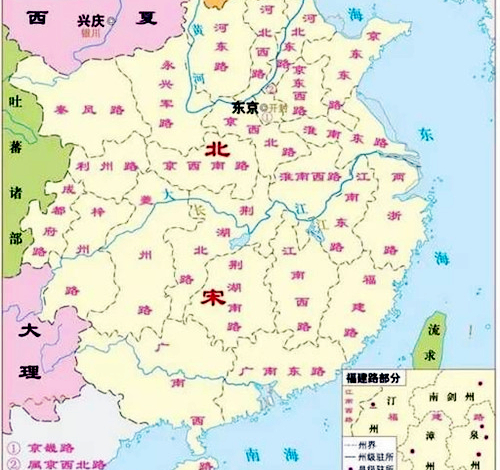 在997年(至道三年)始定天下为15路:京西路、京东路、河北路、河东路、陕西路、淮南路、江南路、两浙路、福建路、荆湖南路、荆湖北路、广南东路、广南西路、西川路、峡西路。