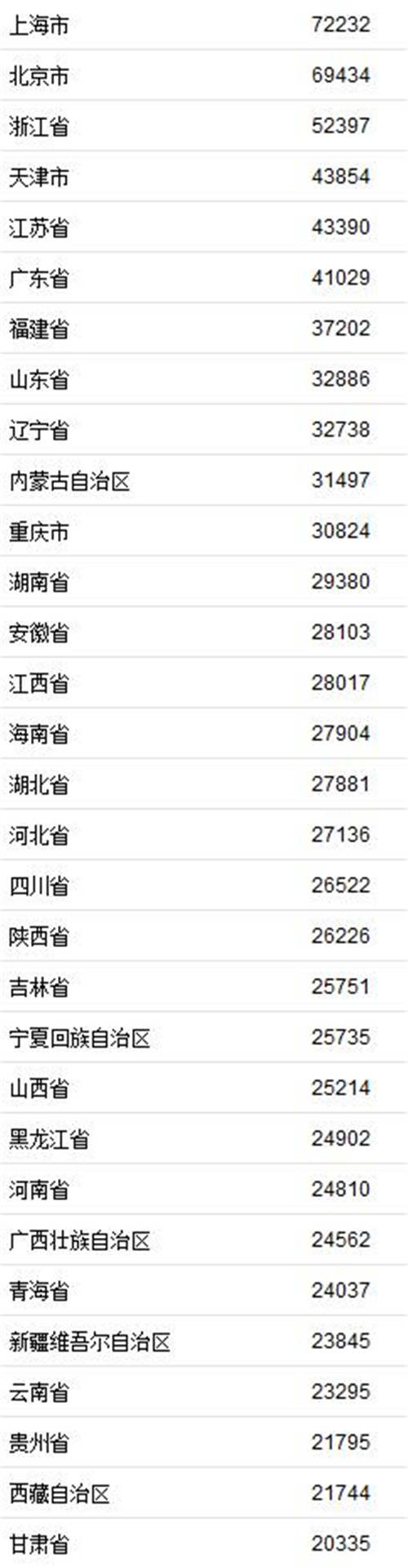 数据显示,上海2020年居民人均可支配收入达到72232元,高居榜首,是全国唯一突破7万元大关的地区。