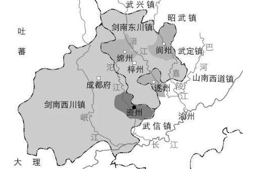 天宝十四年,"安史之乱"爆发。唐玄宗仓惶逃往成都,唐肃宗继位,并向回纥借兵,逐渐挽回了战场上的颓势。为了更好的整合资源,唐肃宗将剑南道一分为二,设立东、西川两节度使,西川节度使领益州、彭州等十八州,相当于今天的成都平原及以西地区。其后在唐代宗时,又把巴州、蓬州等九个州郡划给西川,使得西川节度使的辖区与吐蕃直接接壤。