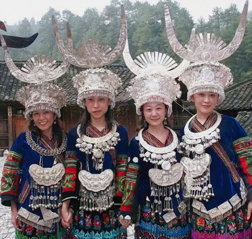 苗族妇女的银饰非常精美,尤其体现在银帽上的银角。