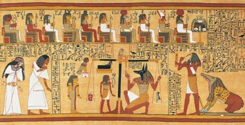 画中狼头人身者仿佛与死亡之神阿努比斯在调整天平的精确度,鹿头人身的书记与著作之神托特正待记录测量结果,天平支柱上蹲着的狒狒则是托特的化身。