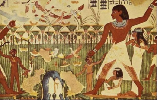 古埃及绘画艺术,大多描绘场景,或表现现实生活,或表现神灵社会,在表现形式上,使用平直简练的线条刻画事物,几乎将形象简化为一种作为生命载体的符号;画面色彩朴素,在褐、白、黄、红的基调中稍加蓝、绿;在表现人物时,恪守固定的造型比例,在外劳作的男子肤色多为棕红色,操持内务的女子肤色则为淡黄或淡红色,人物面部极少表情,姿态端庄呆板,排列符合节奏。