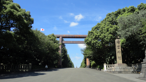 在第二次世界大战的时候,靖国神社曾经作为神风特攻队的出发仪式举办地。往往有日本二战退伍老兵在此举行各种悼念活动。身着二战时期日本旧军装,举行列队示威。