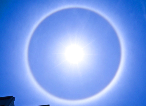 日晕出现时不要长时间用肉眼观看日晕,以免灼伤眼睛。天气要下雨时,往往会在高空中出现象鸟类羽毛般的卷云,接着在卷云的下面6千米左右空中出现含雨的卷层云。由于气温低,云中的水滴变成六棱柱状的小冰晶。太阳光能穿过云层即在小冰晶上发生折射,看上去在太阳的周围出现一个圆圈,由内而外呈光谱色,这就是日晕。
