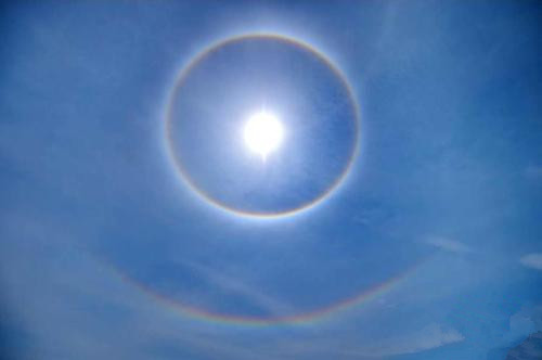 日晕是一种大气现象。它形成的原因是在5000米的高空中出现了由冰晶构成的卷层云,卷层云中的冰晶经过太阳照射后会发生折射和反射等物理变化,阳光便分解成了红、黄、绿、紫等多种颜色,这样太阳周围就出现一个巨大的彩色光环,称为晕。