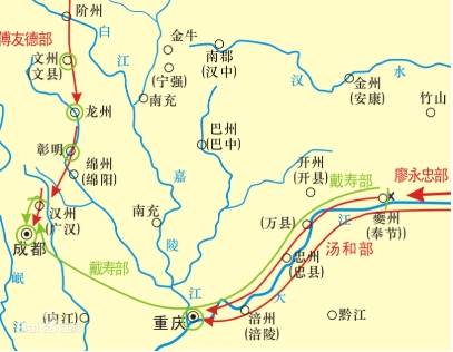 洪武元年(1368年)八月,徐达等率军入大都,元朝灭亡。元朝虽然灭亡了,但其残余势力仍有相当的实力。北方有塞外元残余势力,南方有四川夏政权和云南故元梁王政权。洪武三年,北征沙漠。据史料记载,明太祖朱元璋曾这样认为:“蜀人闻吾西伐,必悉其精锐东守瞿塘,北阻金牛,以拒我师。彼谓地险,吾兵难至,若出其意外,直捣阶、文,门户既隳,腹心自溃。”洪武四年,大军成两路进军四川。南路以中山侯汤和为征西将军,江夏侯周德兴、德庆侯廖永忠为左右副将军,同时积极训练军马,运送粮饷,来为战争做好充足的准备。 夏政权面临强敌,最终选择了主战。