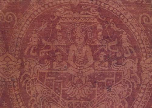 热水墓群出土了很多价值极高的文物,其中有一件织锦,个头很小,有所残破,却在第一批就入选了“中国195件禁止出国(境)展览文物名录”,它就是——红地云珠日天锦。