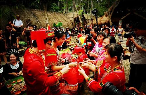 接着,新郎新娘在母亲的陪同下共饮福酒,席间众男女掀起请酒对歌的热潮。其他地区的黎族婚礼,流行新郎新娘用碗共饮福酒的习俗。赛方言区的黎族婚礼,男家请送新娘的人员吃饭时,要在每个饭碗下面放上钱,数量2~10元不等。