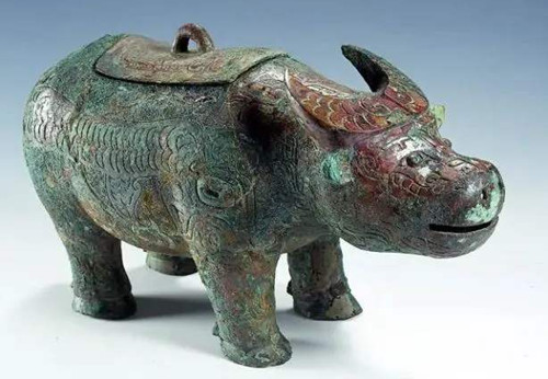 商“亚长”牛牺尊(公元前1300年—公元前1046年)通长40cm,带盖高22.5cm,腰围52.5cm,注口长12.9cm、宽9.1cm,重7.1kg。2001年安阳市殷墟花园庄东地M54出土,现藏于中国社会科学院考古研究所。