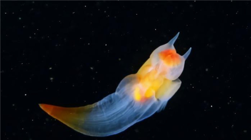 冰海小精灵学名为Clionelimacina,又被称为“冰海天使”。当它们在海水里展翅游泳时,小翅膀看起来像天使的翅膀。这些小生物有些看上去像水母,也有些像萤火虫,其实它是一种翼足类软体动物。这种生物通体透明,在水中冉冉飘动,姿态十分优雅。它们透明的身体包含了头、腹、尾3个部分,身体中央有着红色的消化器官,看起来像一颗火热的红心。冰海小精灵体形最大不过3 cm,通常生活在离岸水域,人们对它的生活习性至今仍不是十分清楚。