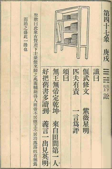 从图片可以看出,上面还画了实物的,有很多书籍还有好像竖着一把琴的一个感觉,全部都放在柜子里面了,所以从这个图是可以看出来的,那就是紫薇圣人的两大爱好其实就是指的:“读书和弹琴了”。