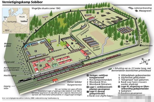 索比堡灭绝营位于卢布林的索比堡村附近,成立于1942年3月。这是莱因哈德灭绝波兰犹太人计划的重要组成部分。在这个人间地狱里,先后有25万欧洲犹太人被杀害。乘火车到达这里的犹太人平均存活时间不到一天。除了一部分有专业技能的人,大部分都会被立即送进毒气室处决,只剩下财产和衣服来支撑帝国的“大业”。
