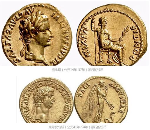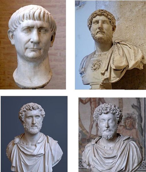 左上:图拉真(公元97年-117年)右上:哈德良(公元117年-138年)